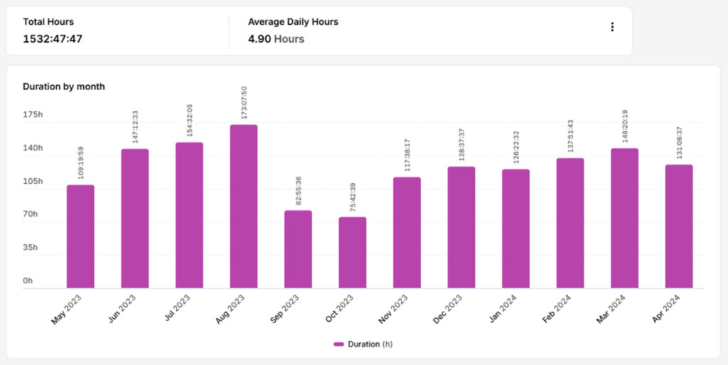 上のグラフが妻と二人暮らしをしていた時期の1年間の労働時間で、この年は結婚式を上げたり海外旅行に行ったりとプライベートにもそれなりに時間を割いた上で労働時間もある程度確保できていました。