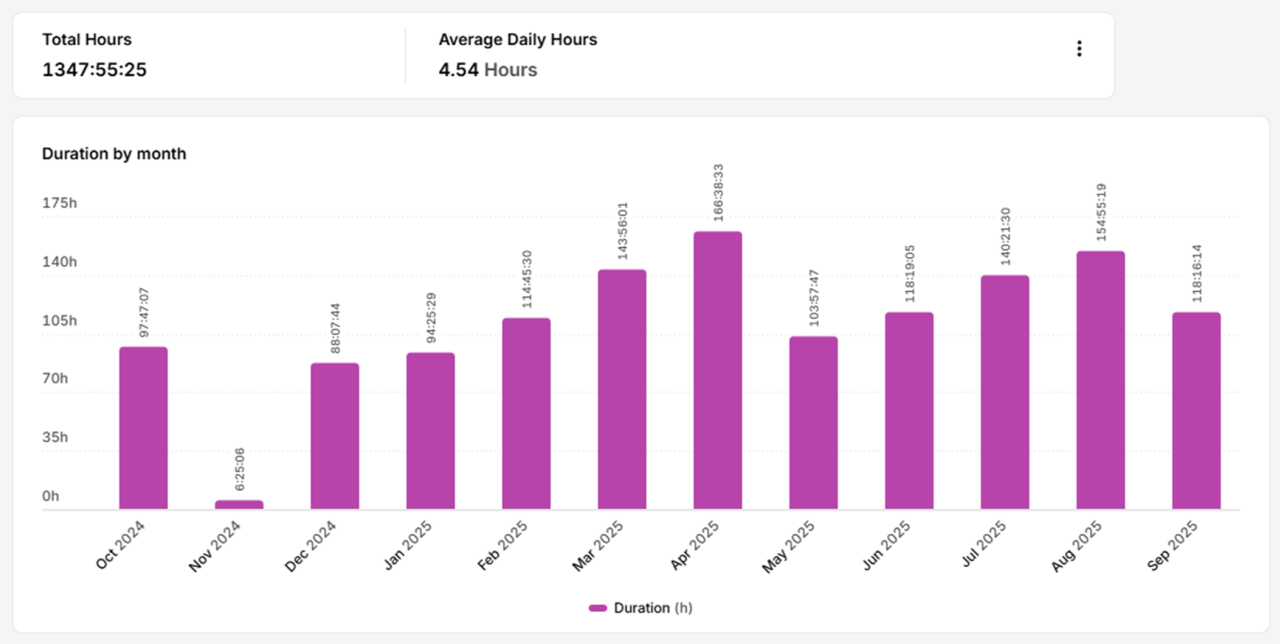 一方で下のグラフが2024年10月に子どもが生まれてからの1年間の労働時間で、年間の労働時間の差は約185時間という結果になりました。
